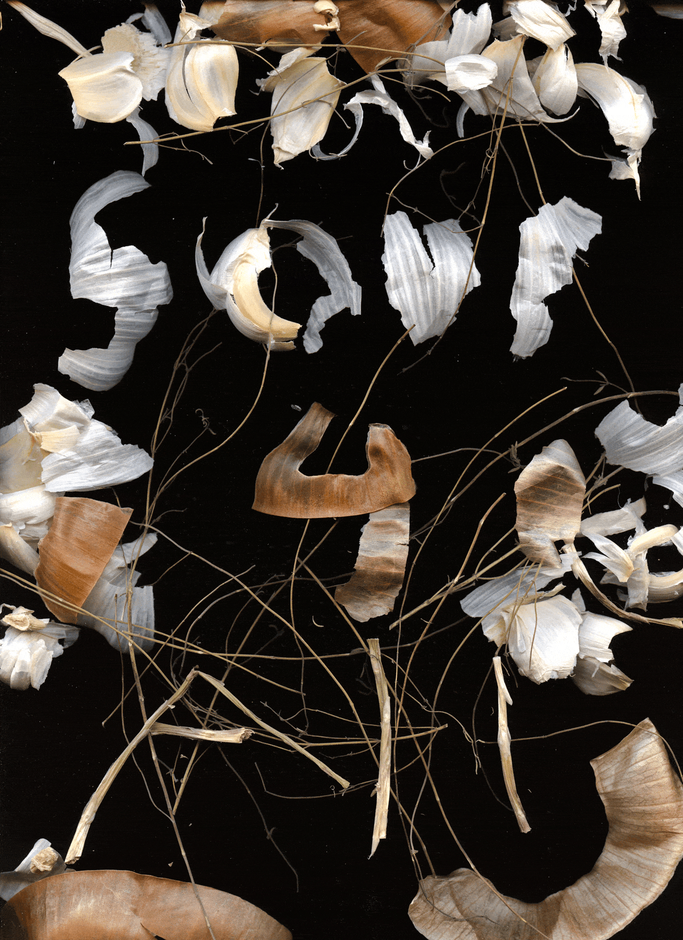 The food scraps, the paper remnants, the extras, the unused, the trash, the misprints, the leftovers, they are not just byproducts of what's being produced, they are proof of the process. The onion skin is an archive that soup-making is a labor of love, and a thin slip of purple paper is a receipt for a long night of paper cutting and assembling.